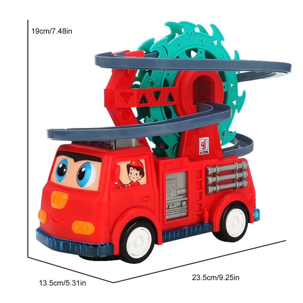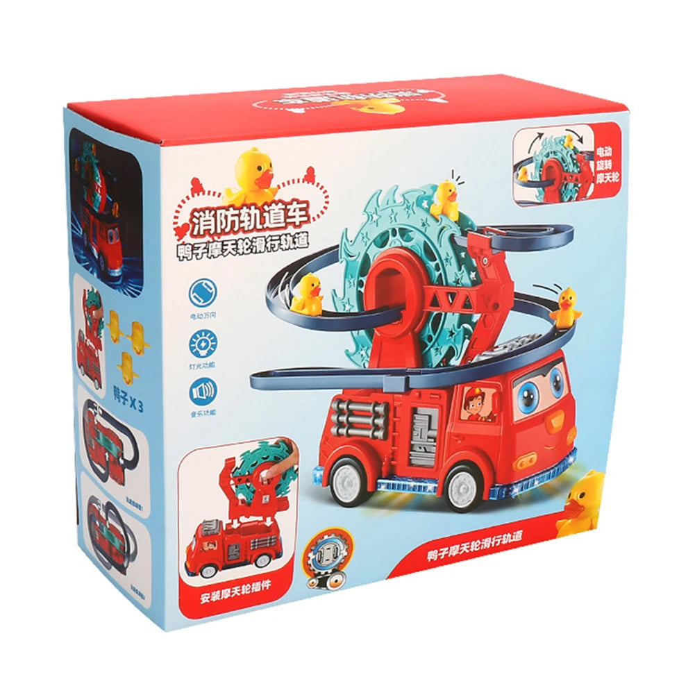 4. Ferris Wheel and Slide: In addition to the fire truck and staircase, electric track slide toys features a simulated ferris wheel and a slide. Children can make the fire truck rotate on the ferris wheel or let the duck slide down the slide, creating more imaginative play scenarios.