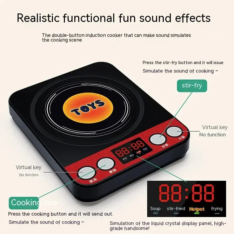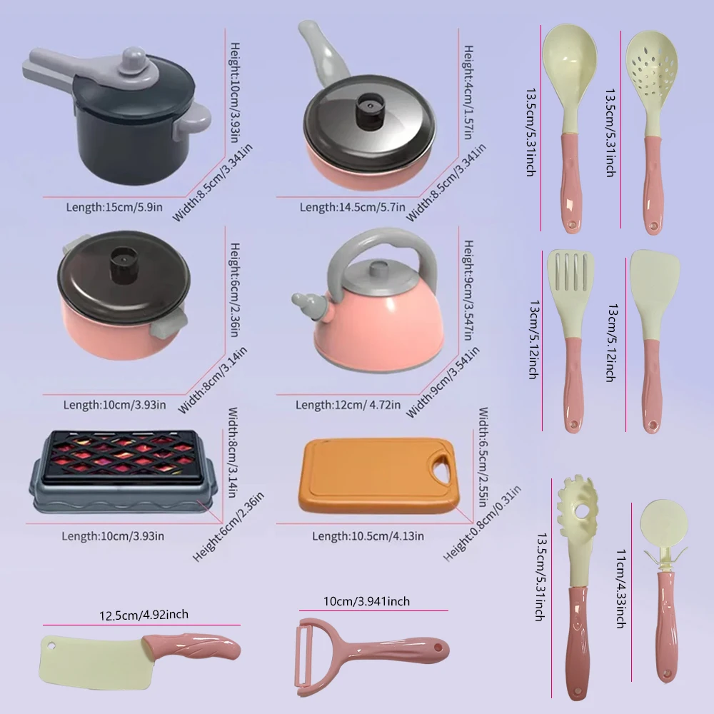 1. Complete Toy Kit -This pretend cooking sets include pots and pans, plates and dishes, kettle, spoon, shovel, fork, cutting board, fake food like fruits and vegetables/egg/fast foods etc. Great cute addition for any play kitchen.