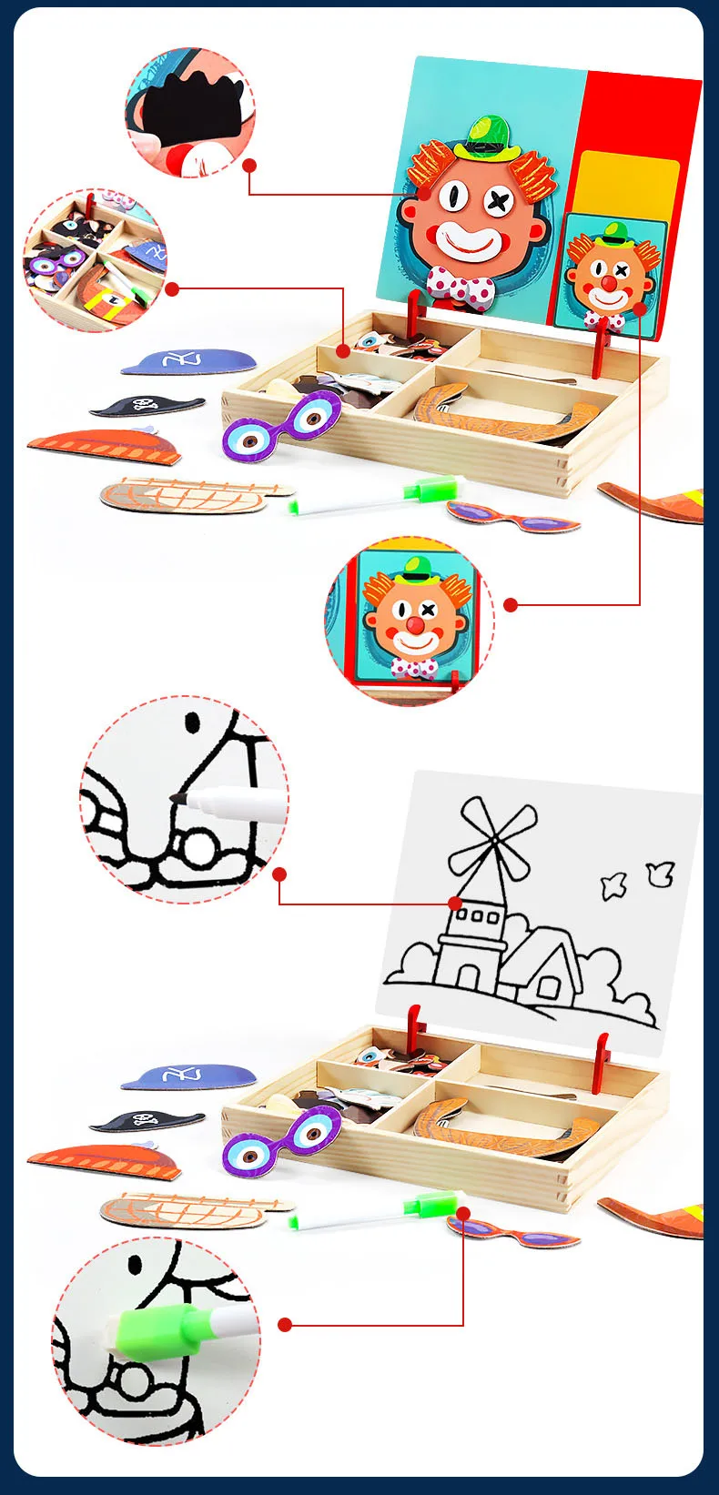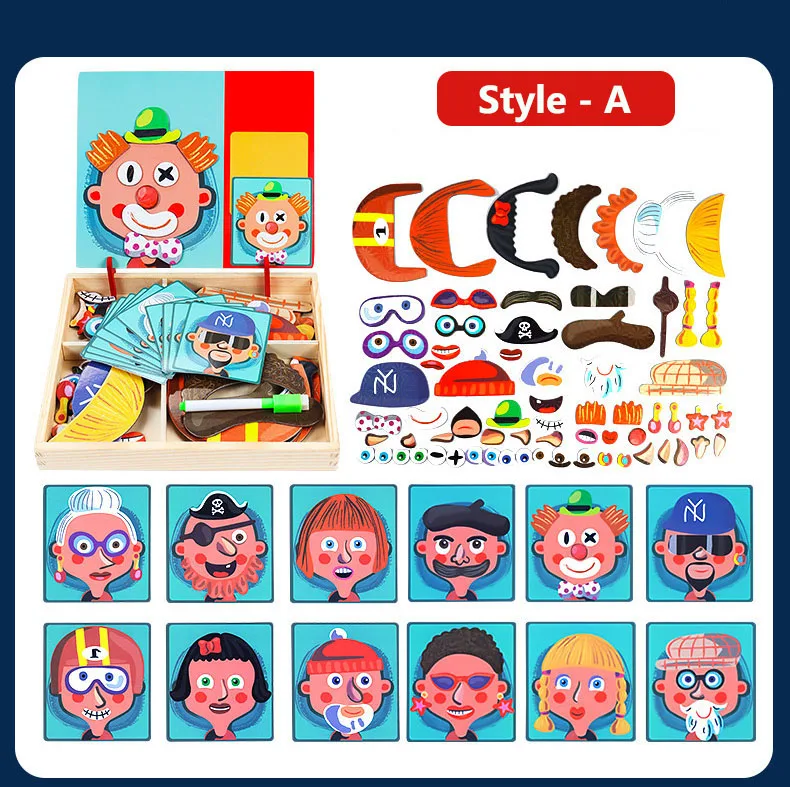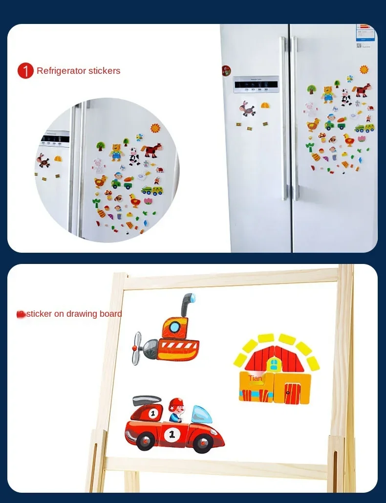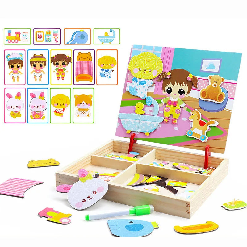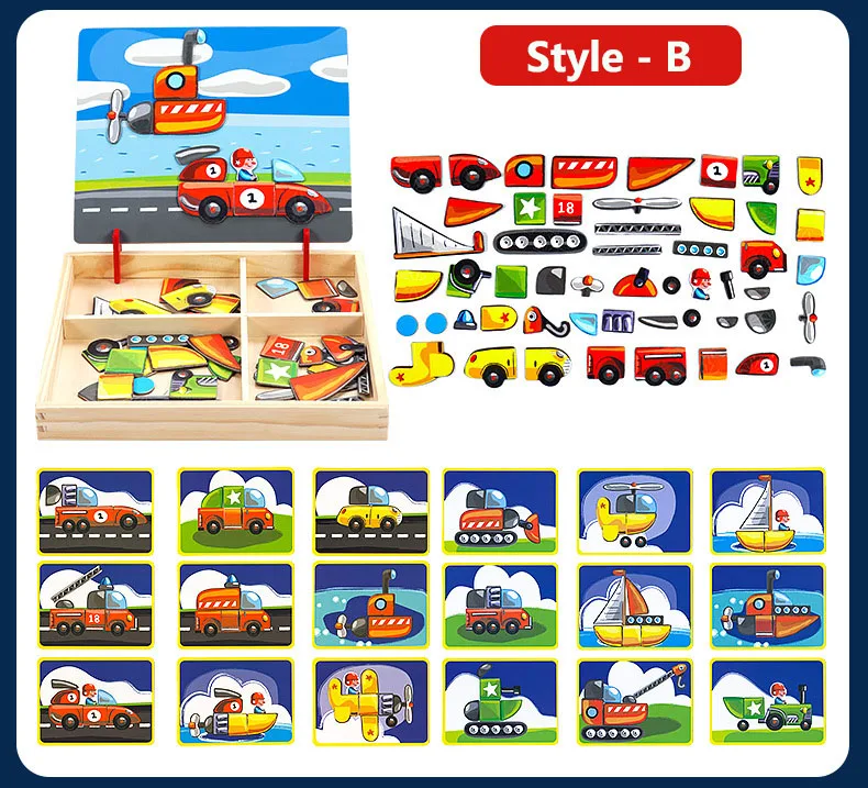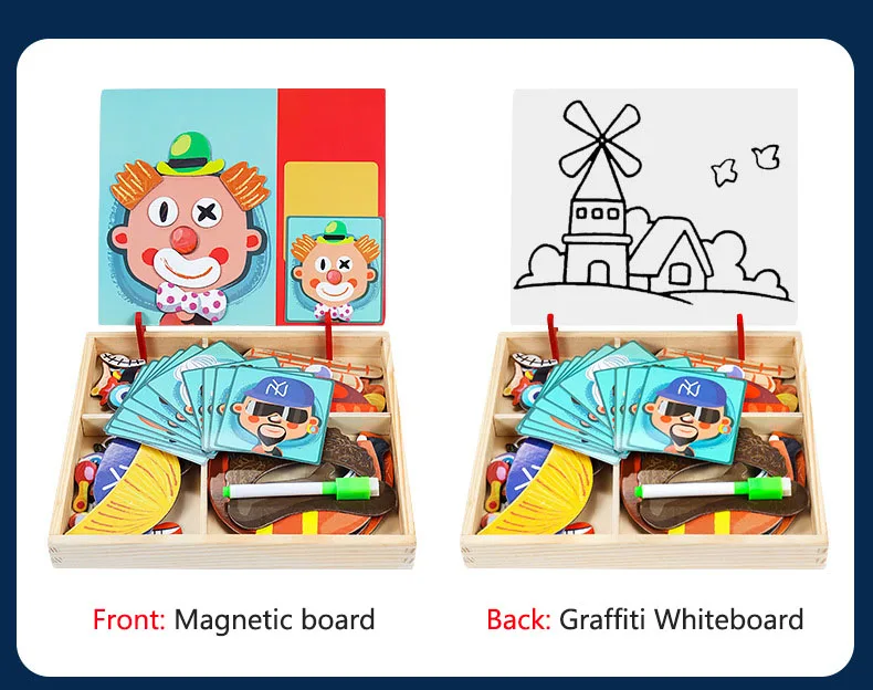 With a box of chalk, a pen, you can draw and write on each toy with black and white double-sided magnetic board above. Muhe itself is a storage box storage, exquisite design makes black and white board can be very easily turned up and inclined at an angle fixed on the box. Toys allow children to recognize shapes and colors, to cultivate children's spatial thinking ability, exercise the child's imagination, give full play to children's creativity. Parents can assist in the side or family can play, promote emotional communication between parent and child, magnetic puzzles made of wood + stickers + magnetic material, do not wash.