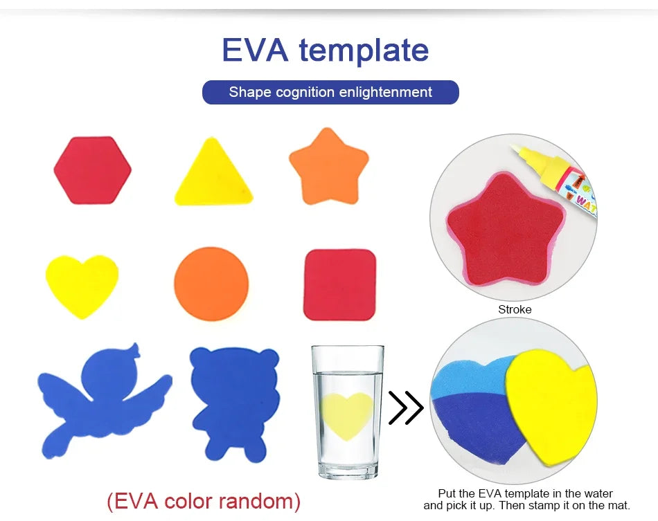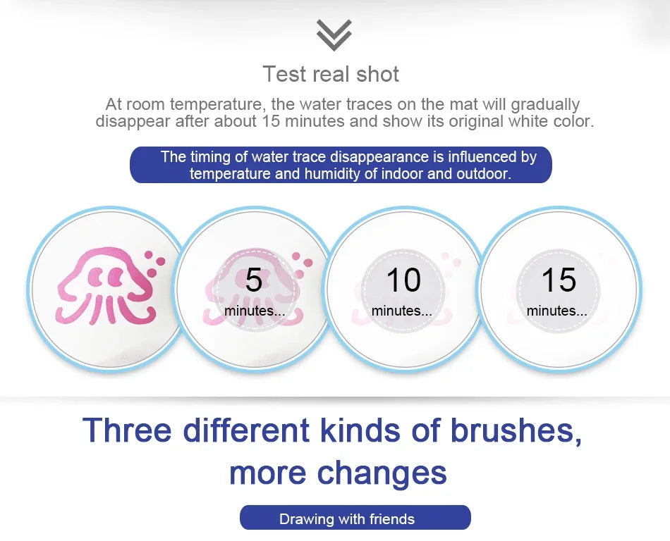 Fill the pen with clean water and draw on the magic drawing mat. After 3-10 minutes, it magically disappears (depending on temperature and airflow), and children can paint on the drawing mat again and again.