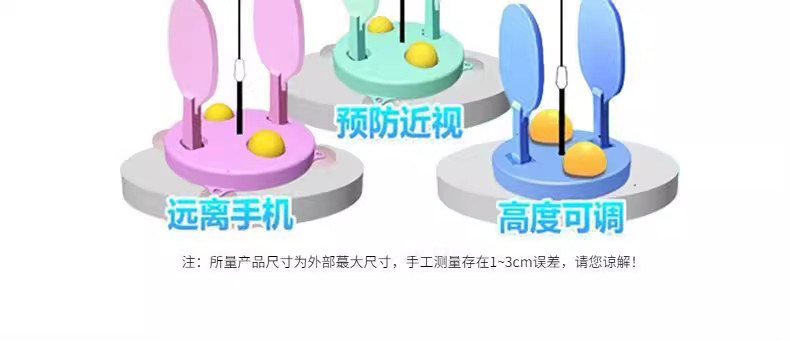 Color classification Blue 1 chassis+2 rackets+3 balls adjustable in height, green 1 chassis+2 rackets+3 balls adjustable in height, pink 1 chassis+2 rackets+3 balls adjustable in height, blue+pink 2 chassis+4 rackets+6 balls, blue+green 2 chassis+4 rackets+6 balls, green+pink 2 chassis+4 rackets+6 balls, blue+pink+green 3 chassis+6 rackets+9 balls