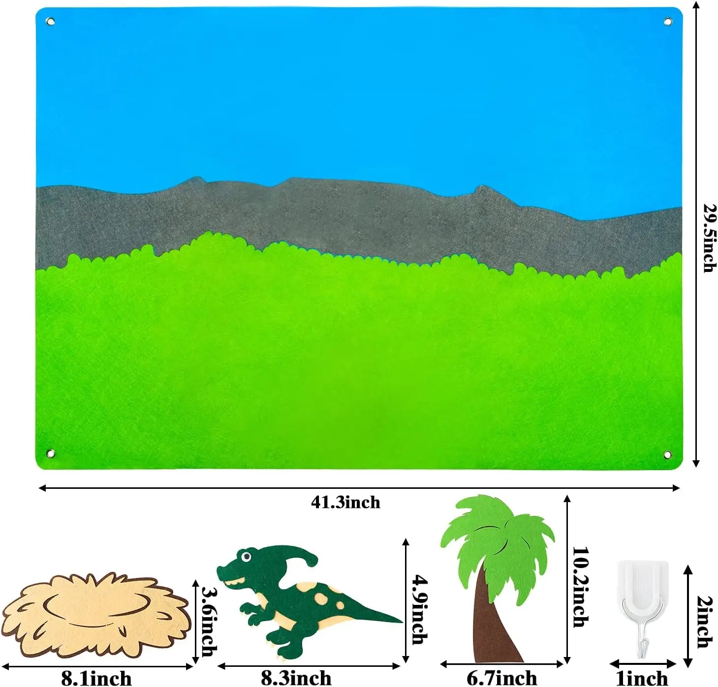 Dinosaur Felt Kit: Giant 3.5ft dinosaur felt toy kit. Comes with 32 pieces comfortably sized for little hands. This interactive felt piece can be moved repeatedly on the felt board. With 4 sturdy hooks, the large felt backdrop is easy to hang.